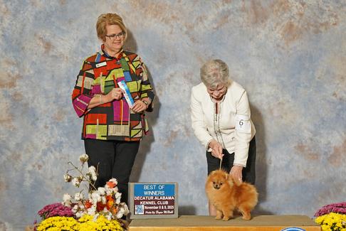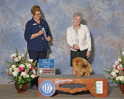 Finished her Grand Championship in one long weekend going BOS or Select everyday at the APC Summer National combined with Pomeranian Club of Greater Houston shows.